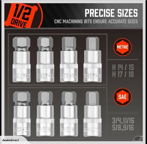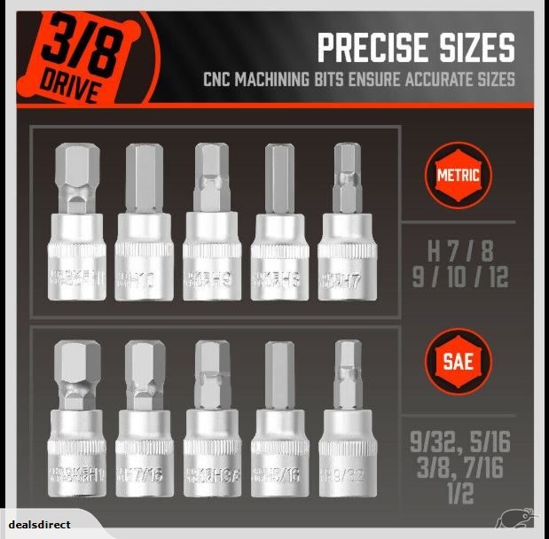 3/8” Drive: 9/32”, 5/16”, 3/8”, 7/16”, 1/2”;