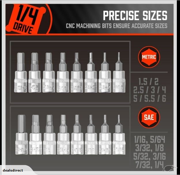 1/4” Drive:1/16″, 5/64”, 3/32”, 1/8”, 5/32”, 3/16”, 7/32”, 1/4”;