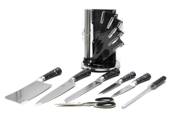 1 x cleaver knife1 x serrated bread knife1 x chef’s knife1 x utility knife1 x paring knife1 x knife sharpener1 x scissor 1 x knife block (base)