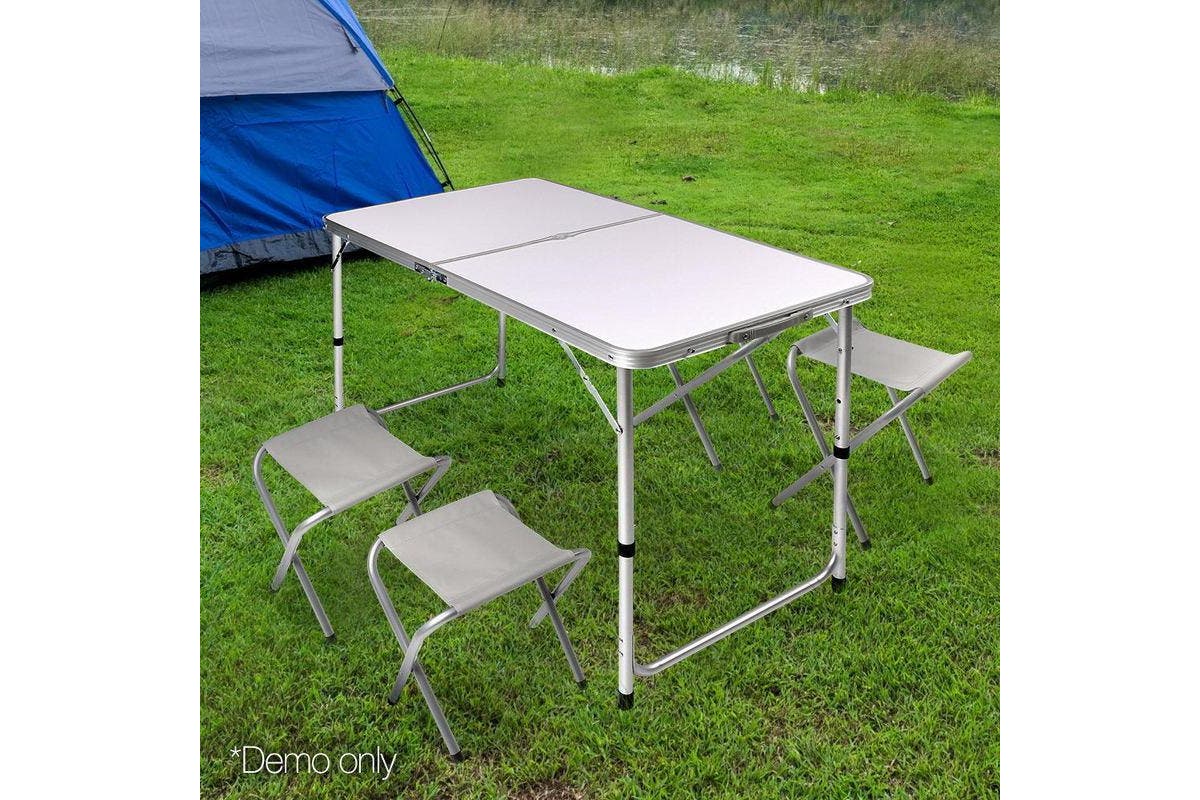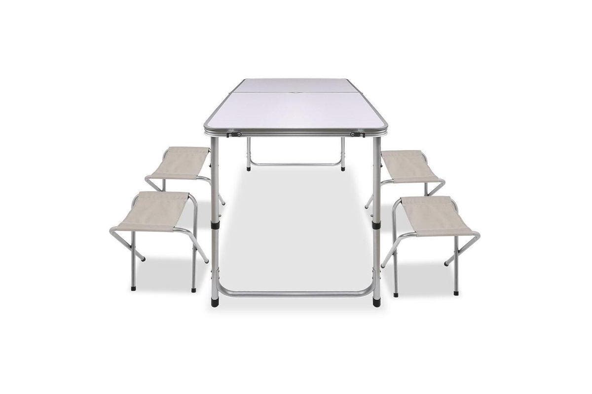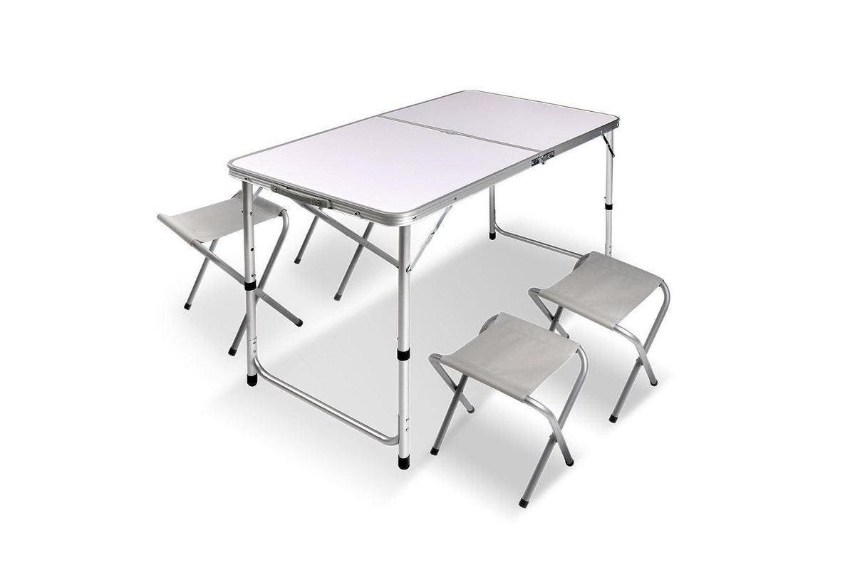This aluminum camping table and seat set combine rugged durability and portability. The table and seats fold into a suitcase-style for easy transportation. The aluminum construction is strong yet light. The seats provide enough space for up to 4 people.